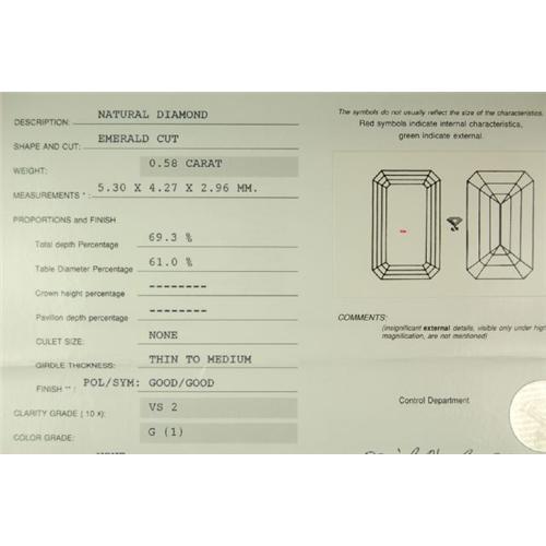 This ANTIQUE Style Engagement Ring features an EMERALD CUT DIAMOND = .58 CARATS! This Diamond is FINE 'G' Color and VERY FINE 'VS2' Quality. This Stunning PLATINUM setting is an EXACT REPLICA of an ORIGINAL ANTIQUE ENGAGEMENT RING. The Emerald Cut Diamond is set low in the ELEGANT PLATINUM mounting. The mounting also features 8 bead set DIAMONDS on the sides, with milgrained edges and a detailed design. The DIAMOND TOTAL WEIGHT = .66 CARATS! The ring is now a Size 5 3/4 and it can be resized either larger or smaller. It IS in MINT condition.