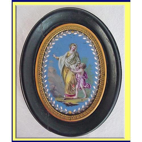 French enamel handpainted oval porcelain plaque depicting a Greek goddess with a cherub. Circa 1800.<BR>Wood frame is just under 4inches high. Porcelain is slightly over 2 1/2inches high.<BR>Blue ground. A Greek goddess strides alongside a little cherub, holding up a book. In the background is a hill with a Greek temple, the Parthenon. The vignette is surrounded by a delicate pattern of leaves outlined in gold. There is a very nice gilt bronze inner frame. The outer, wooden frame has been cracked and badly repaired. The porcelain & inner frame are in good condition.