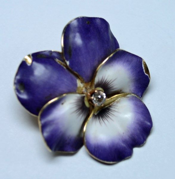 A single cut European diamond sparkles from the center of this beautiful purple and white enameled pansy. Early twentieth century. 1 1/4" x 1 1/8'
