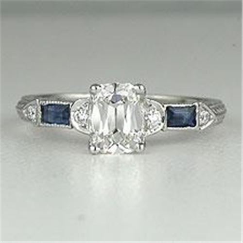 This ANTIQUE Replica ART DECO ENGAGEMENT ring is PLATINUM and it features a CUSHION CUT DIAMOND = .63 CARATS! This is the FINEST 'VVS2' QUALITY and the FINEST 'H' Color. The Cushion Cut Diamond is set low in the Platinum ring, and there is a Geometric pattern of round Diamonds and Baguette Blue Sapphires. This magnificent ring has a 'knife' edge shank and detailed CHASING all around. It is a Size 5 1/2 and it can be resized both larger and smaller.