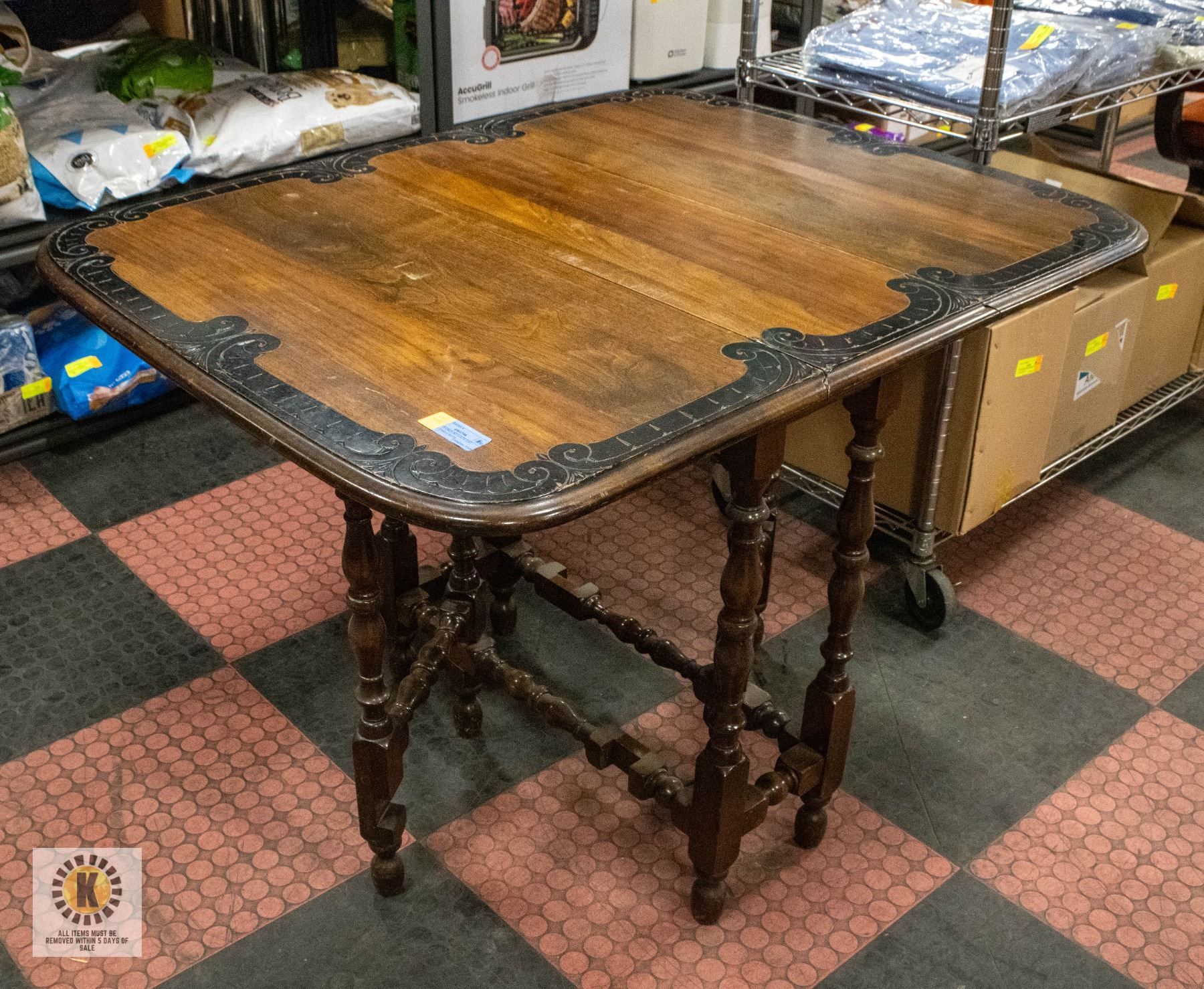 "SPINDLE SPOOL" LEGS DROP SIDE LEAFS & HAND CARVED/ETCHED TABLE TOP PERIMETER (TOTAL H-30" W-33" L-42" WHEN FULLY EXTENDED) **ALL ITEMS MUST BE REMOVED BY 5PM SATURDAY, APRIL 5TH 2025. ALL REMAINING ITEMS WILL BE SUBJECT TO A $6.00 PER DAY STORAGE CHARGE. ANY ITEMS REMAINING AFTER MONDAY, APRIL 21ST 2025 WILL BE CONSIDERED FORFEITED. NO REFUNDS WILL BE ISSUED FOR FORFEITED ITEMS. TO SCHEDULE A PICK UP APPOINTMENT CLICK HERE