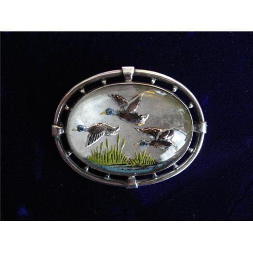 A superb Art Deco or possibly a little earlier sporting motif essex crystal brooch. This is a wonderful example having 3 ducks in flight, the colors and hand painting is most attractive all on a lustrous mother of pearl background. The Reverse carved intaglios were very popular in the Victorian era coming all sorts of designs and examples, especially depicting sporting, hunting, cats and dogs . These pins remained popular up to the first quarter of the last century. This fabulous example measures 1 .75 inches by 1 .25 inches, all original and is in fabulous condition, marked Sterling. A great addition to your Essex Crystal collection of jewelry.