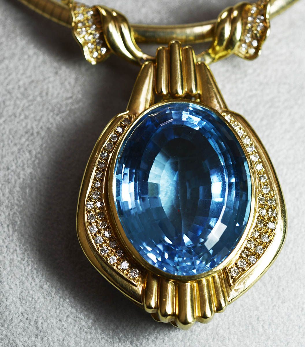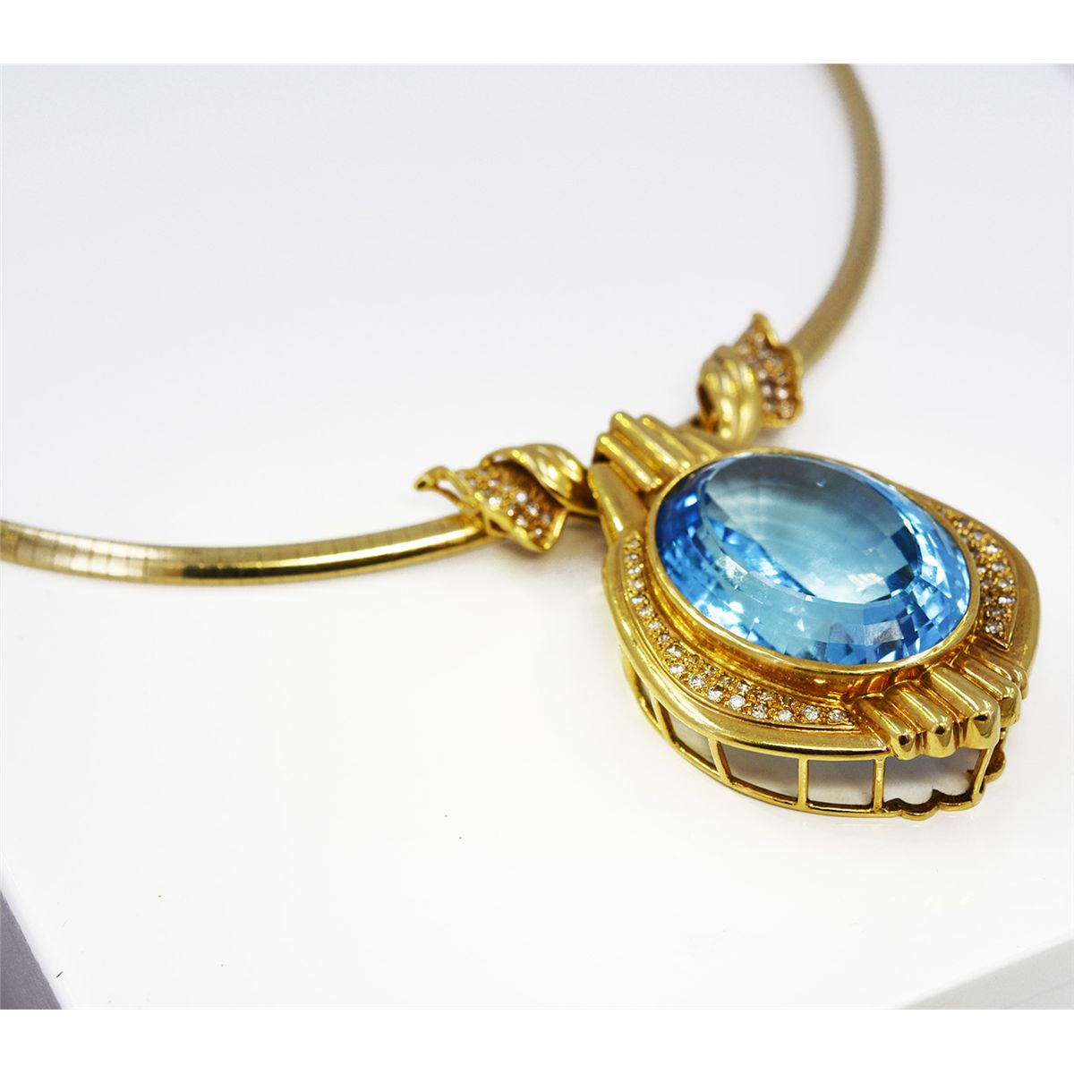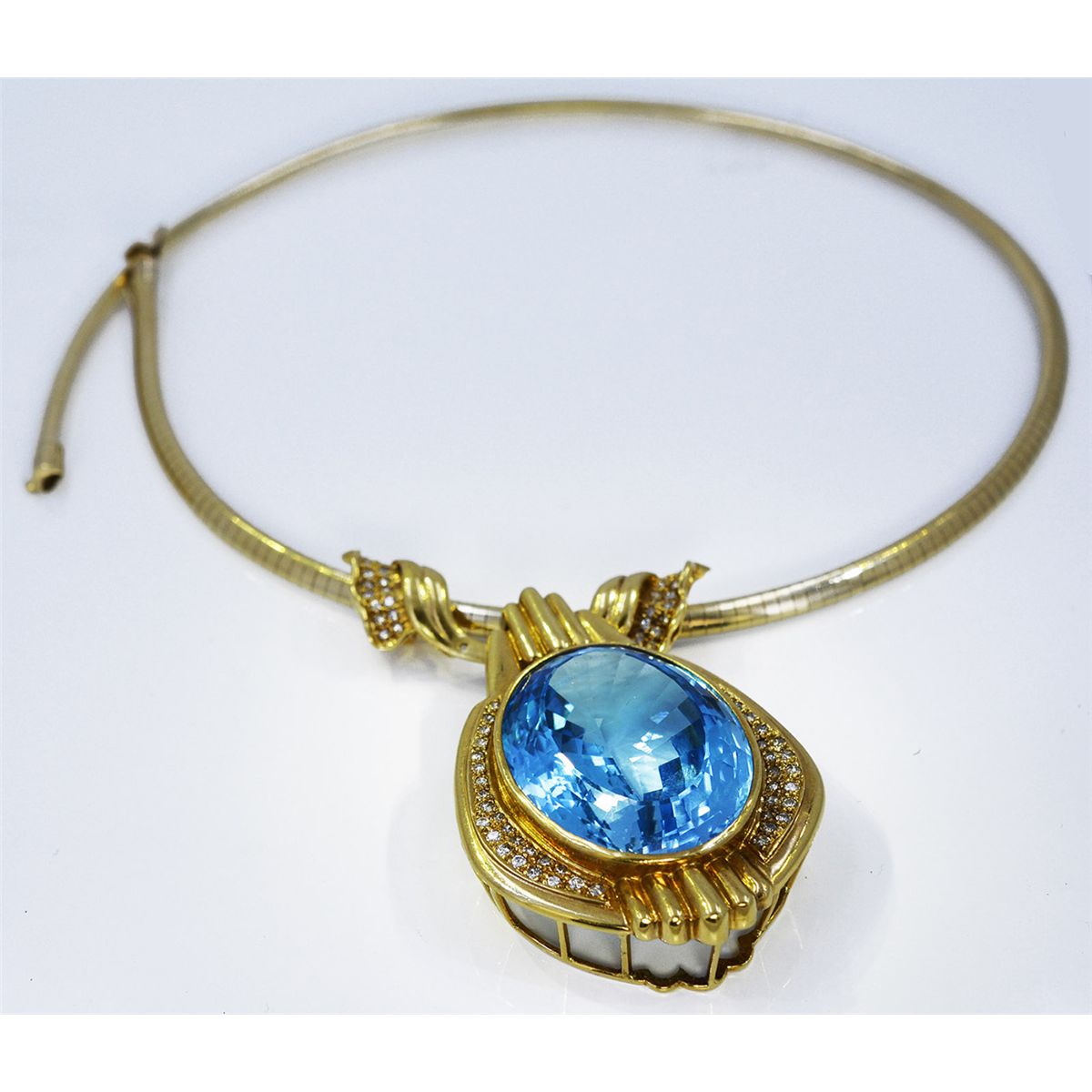18kt Yellow Gold Slider Pendant 50.30 approx grams, 14kt Yellow Gold Omega Necklace 27.30 Approx grams, Approx 100.00ct Blue Topaz Oval cut, Excellent Necklace