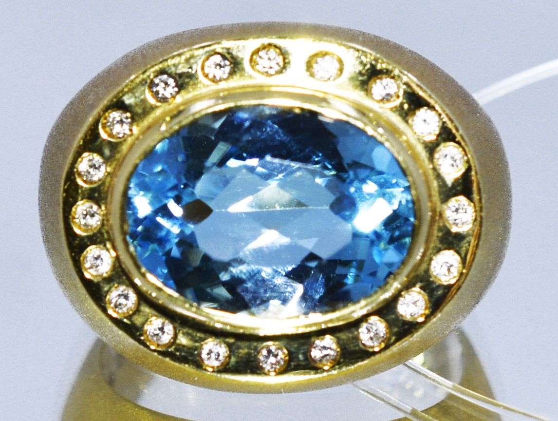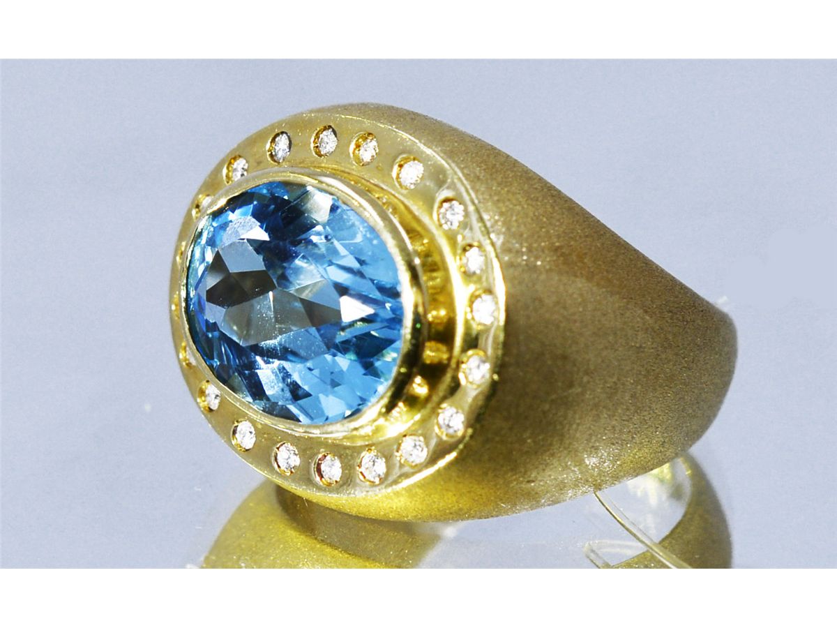 18kt Yellow Gold 15.70 Approx grams, including 20-pc. .60ct Round Diamonds, 5ct. Oval Topaz Ring