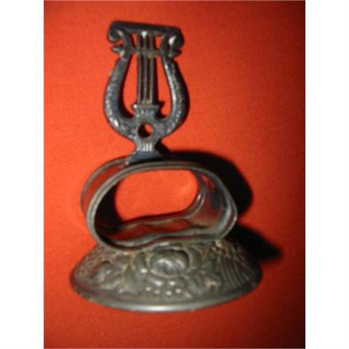 ANTIQUE HARP SHAPE (MUSICAL SHAPE) NAPKIN RING. IN FAIR CONDITION. VERY COLLECTIBLE AND NICE. APPROX. 4 INCHES LONG AND 3 INCHES WIDE. QUADRUPLE PLATE (SILVER PLATE) 289- NORMAL WEAR AND TEAR FOR SUCH A PIECE. BY MERIDEN SILVER COMPANY . ITEM SOLD AS IS. CIRCA AROUND 1850 - 1899.
