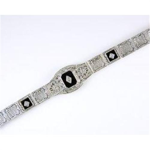 THIS VINTAGE STYLE BRACELET ACCURATELY REPRODUCES THE EXQUISITE FILIGREE WORK SO POPULAR IN THE 1920'S AND 1930'S. The Bracelet is all Sterling Silver and it features 3 Black Onyx, and each one is set with a Diamond in the center. This bracelet is 7" in length, and it is 3/4" at its' widest. It is in MINT condition.