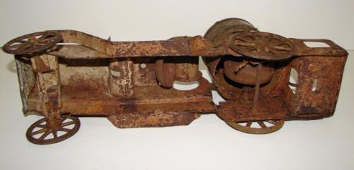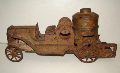 ANTIQUE FIRE ENGINE BELL PULL TOY. Shows major signs of rusting and loss to paint. 14.25” L
