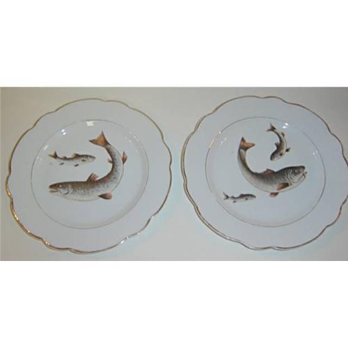 A LOVELY PAIR OF FISH PLATES FROM THE LATE 1800'S ARE GREAT FOR DECORATIVE PURPOSES OR TO USE AS TABLE SERVICE. THEY MEASURE EIGHT AND ONE HALF INCHES AND ARE IN GOOD CONDITION. THE ONLY MARKING ON THE BACK IS OF NUMBERS INCISED INTO THE PLATE THEN GLAZED OVER.YOU CAN OWN THESE WITH PRIDE.