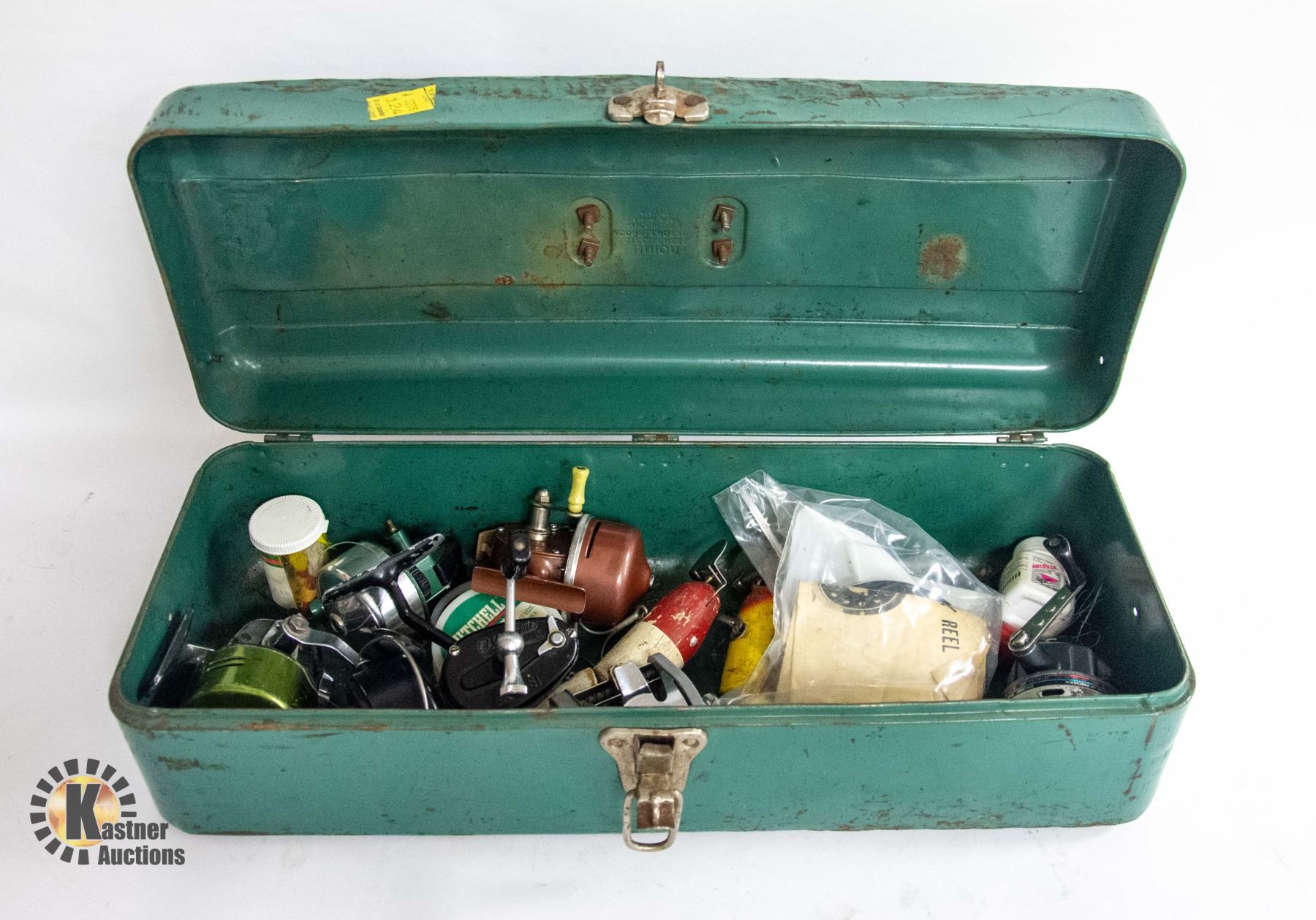 ANTIQUE FISHING BOX FULL OF REELS & MORE