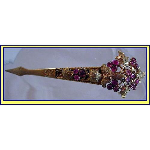 Victorian era shoulder brooch / long pin for securing a shawl or coat. Fine openwork and embellishedGold over silver set with natural rose-cut rubies.<BR>4 1/4inches long.<BR>Pin in the form of a dirk with most of the surface covered by fabulous openwork leaves and berries/flowers formed by rose cut rubies. The shape curves to conform to the shoulder.<BR>Possible origins are France or Hungary.<BR>Great condition with one possible repair underneath a leaf (on the back and totally invisible).