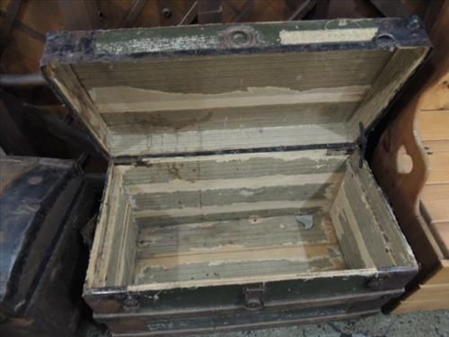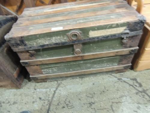 ANTIQUE FLAT TOP TRAVEL TRUNK NO INSERT. OAK STRAP METAL CORNERS. 34X18X21. AS SHOWN. VIEW PICTURE FOR DETAIL.