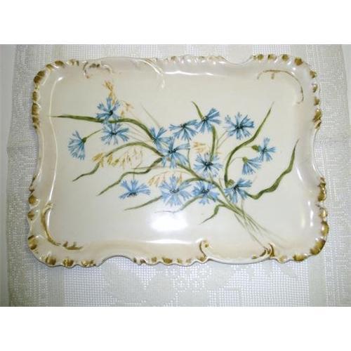 BEAUTIFUL ANTIQUE, ORNATE, VICTORIAN STYLE DRESSER TRAY,HAND PAINTED, DEPICTING CORNFLOWER BLOSSOMS, EXCELLENT DETAIL AND VERY PLEASING COLORS,Very fine used condition, free from major damage, there is tiny,tiny chip under the edge, you can not see it but only feel it,No cracks Due to age gold decorations shows use, as per images, US BUYER TO PAY 9.00 for shipping plus insurance.THANKS.