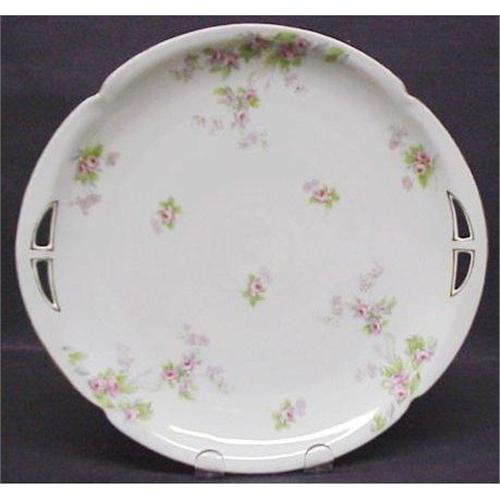 BEAUTIFUL ANTIQUE PLATE WITH TWO OPEN HANDLES AND PRETTY FLORAL DECORATION SHOWING LOVELY TINY ROSEBUDS, EXCELLENT CONDITION, BUT FOR GOLD ACCENTS ON HANDLES AND AROUND THE RIM - SHOWS A BIT OF AGE.MEASURES 10 3/4" X 10 1/4".