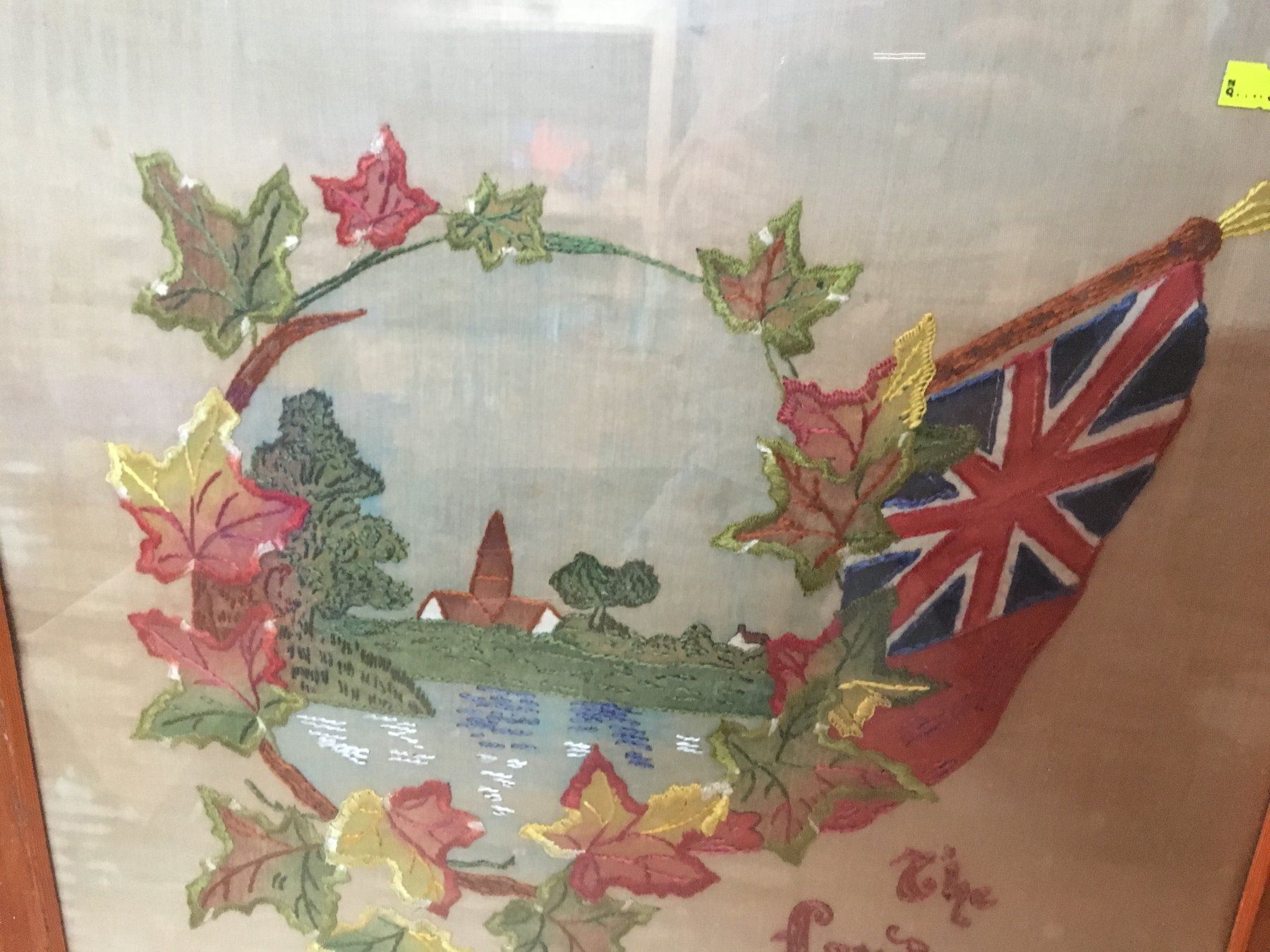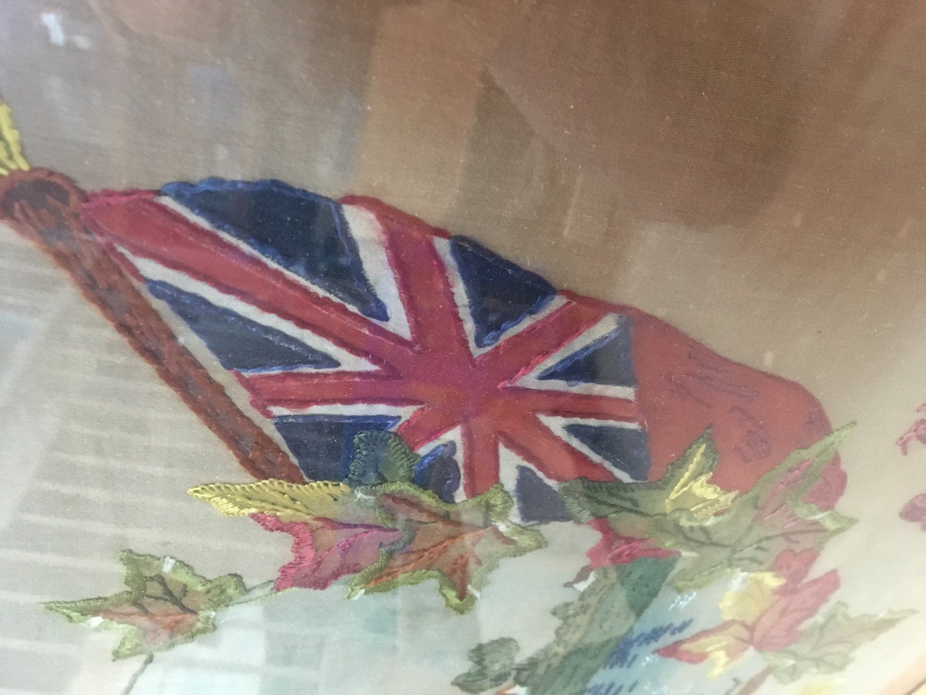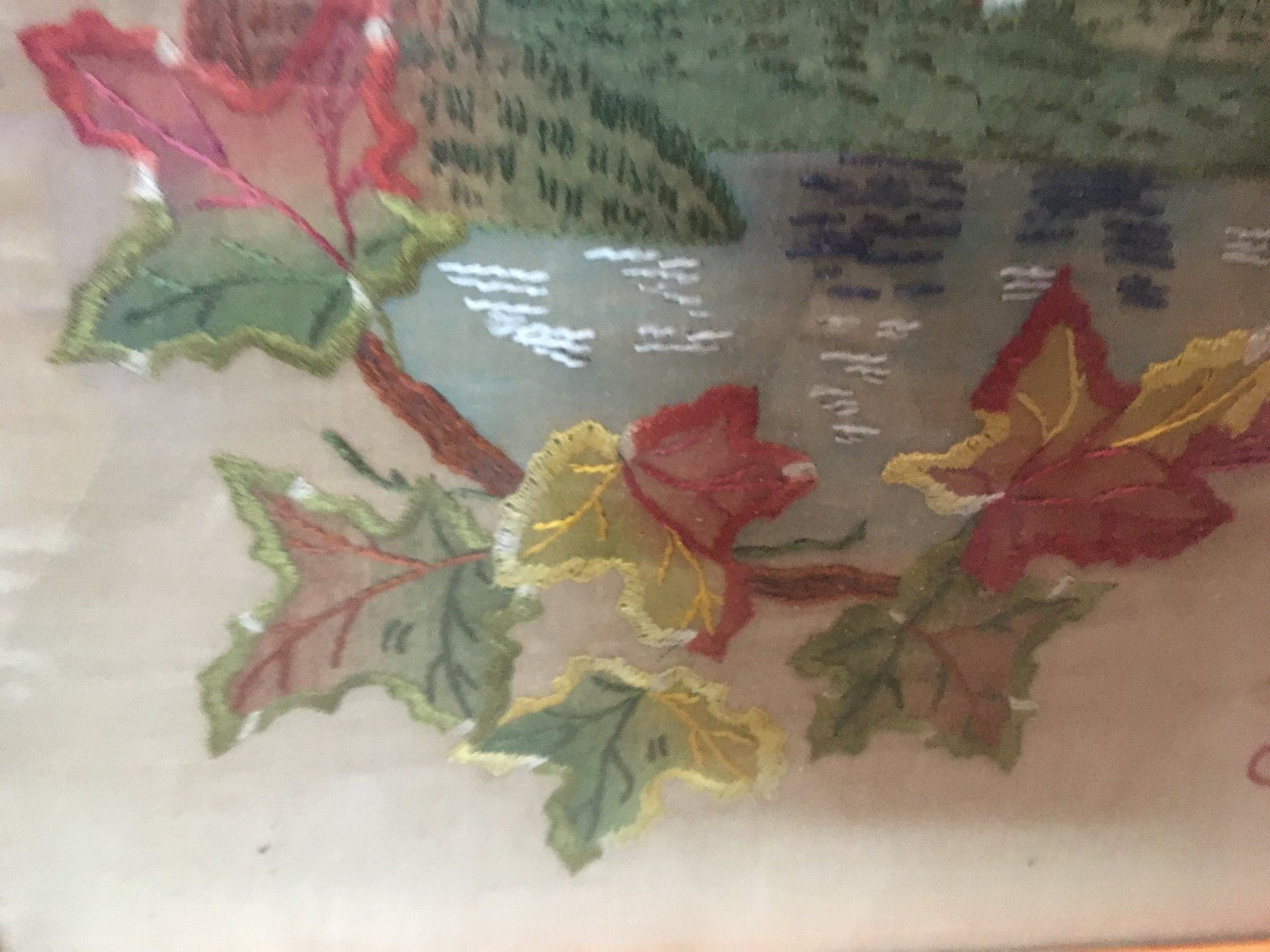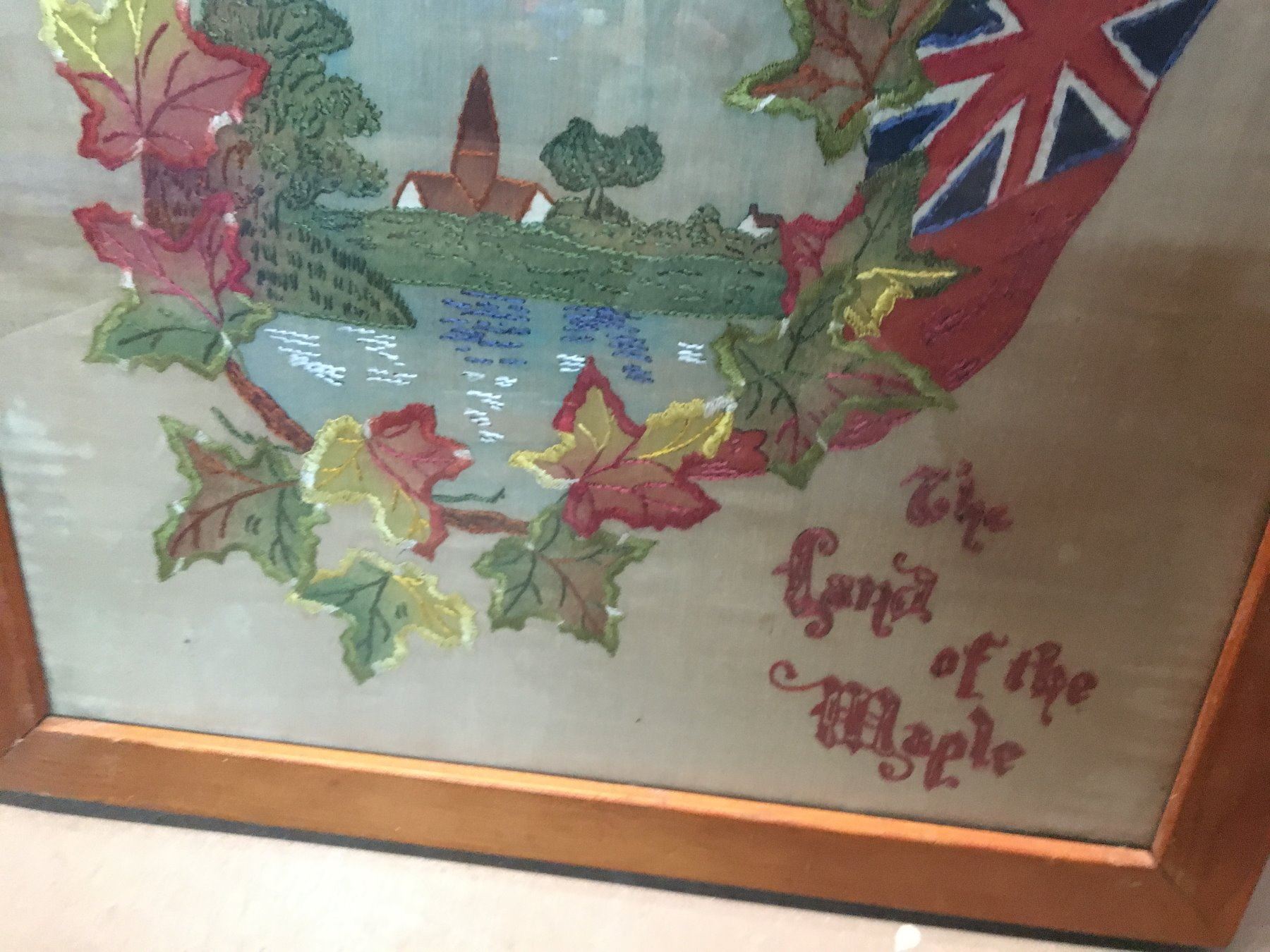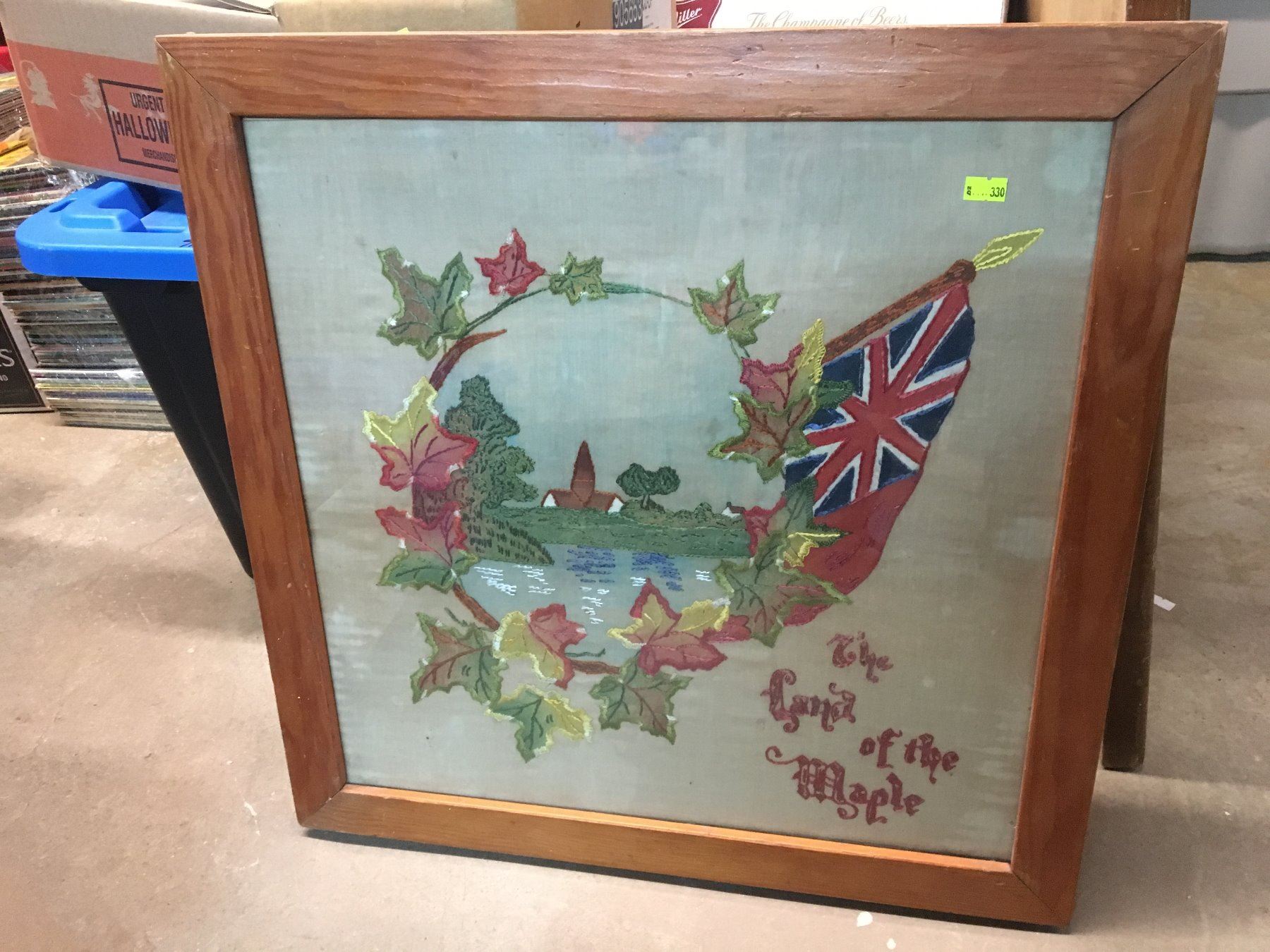 ANTIQUE FRAMED EMBROIDERED PIECE (THE LAND OF THE MAPLE) *22.5” x 22.5”*