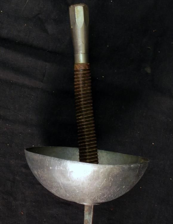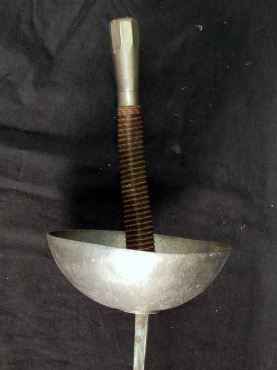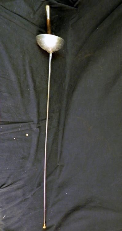 ANTIQUE FRENCH FENCING SWORD-MARKED-43" LONG---OUTSTANDING OLD FRENCH FENCING SWORD--43 INCHES IN LENGTH ROUND METAL HAND GUARD--RICASSO MARKED "OAVLAN AND CO-VERHAGALES, FRANCE" WRITTEN IN ENGRAVED CURSIVE-RUBBER REMOVABLE TIP ON POINT--GREAT PIECE