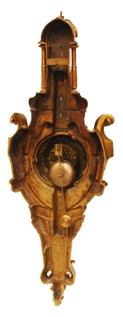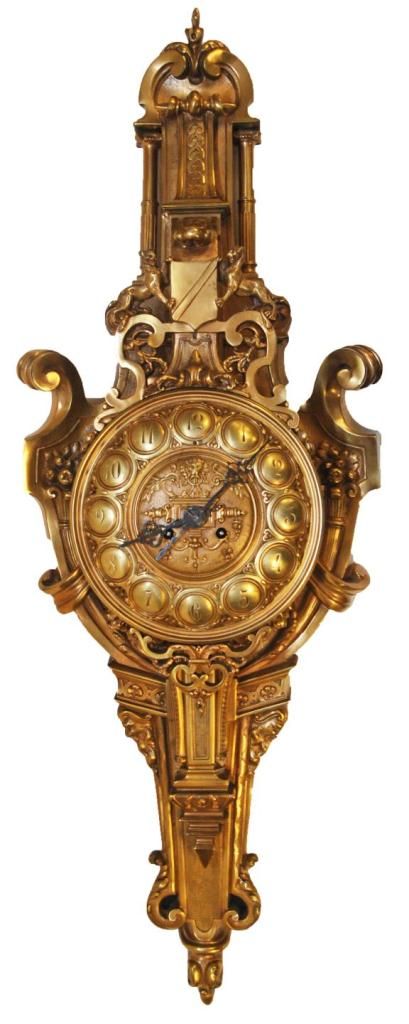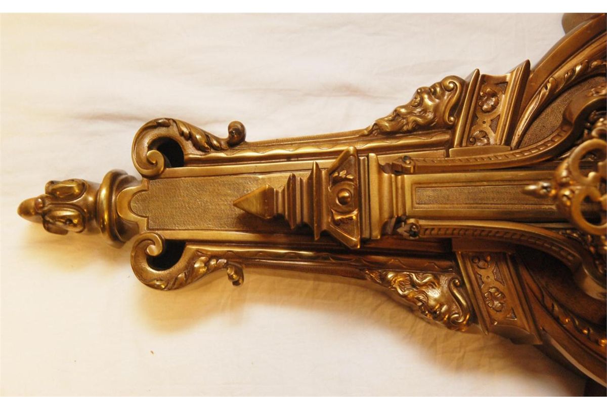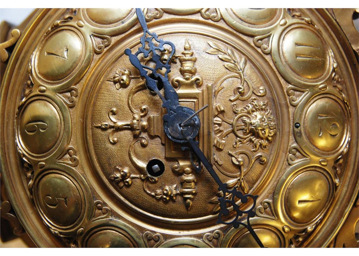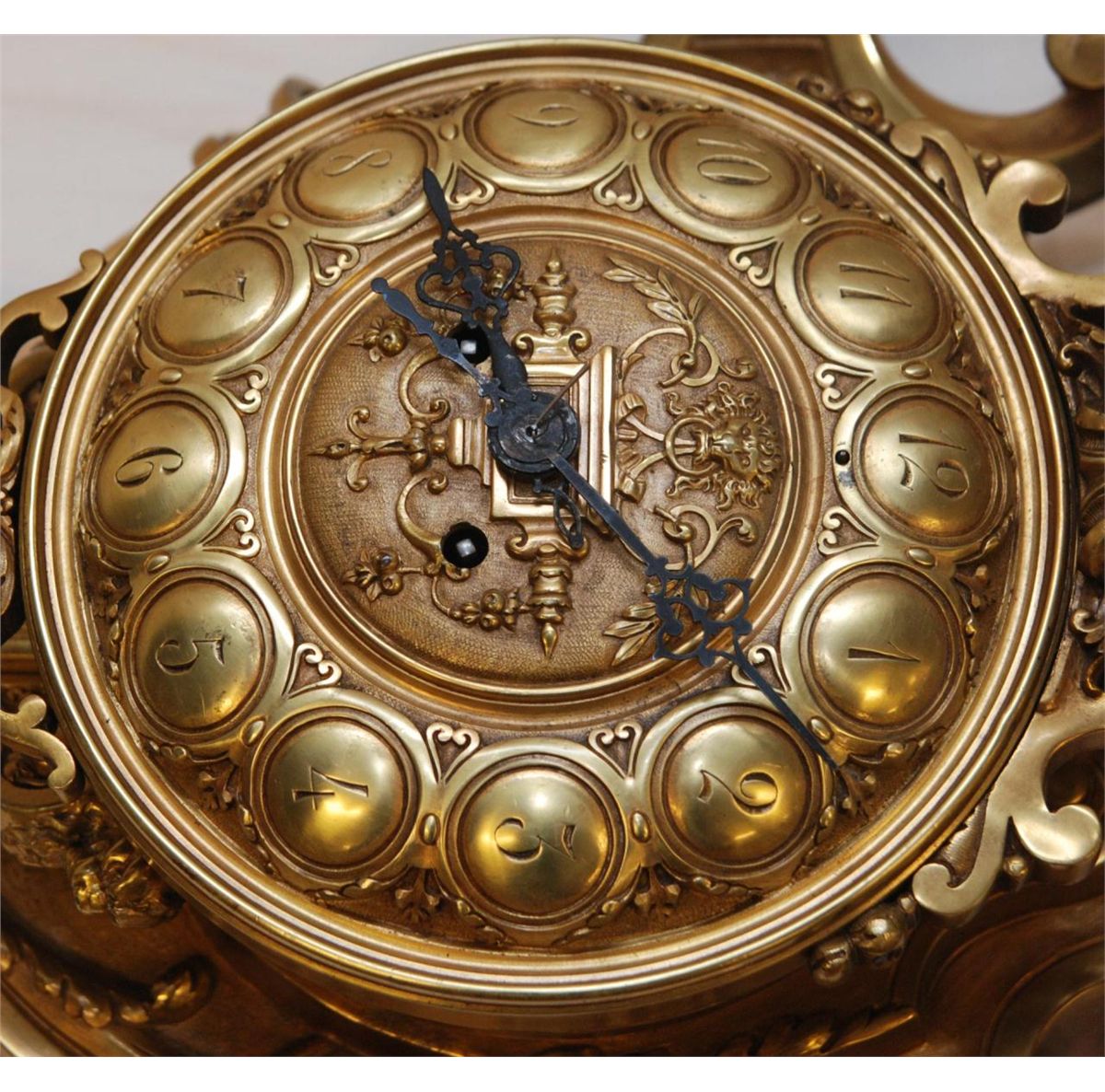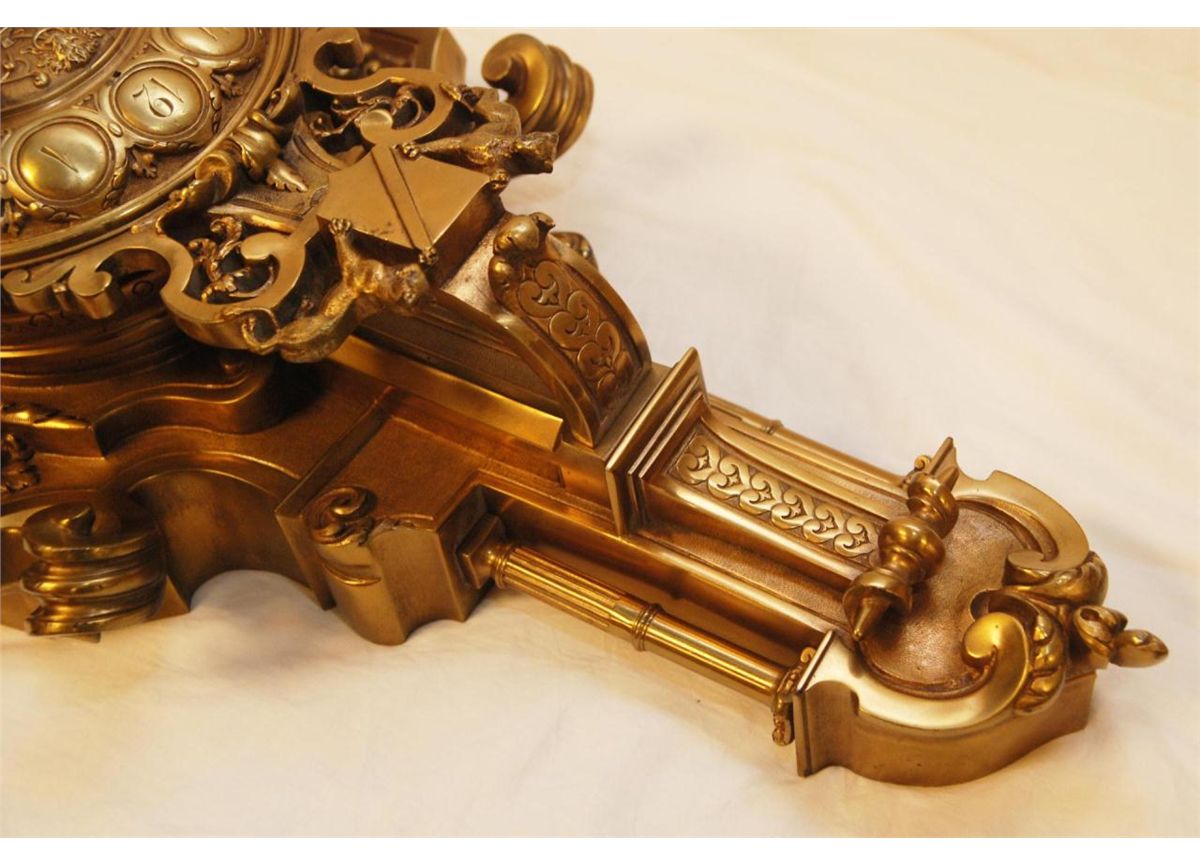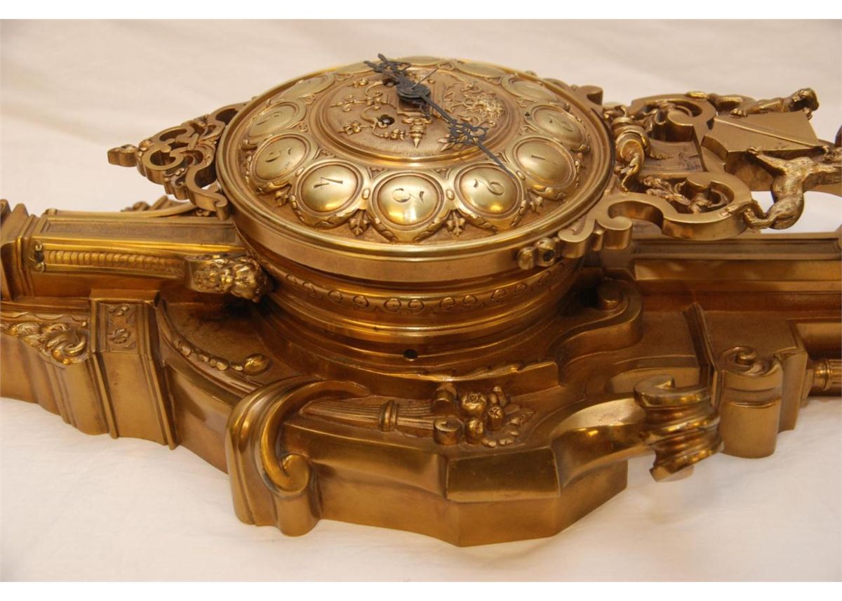 Large French gilded clock having a scrolled design throughout. Has figural tigers flanking sheild crest over raised face having Arabic numerals. 19th century. Measures 36" length x 13" width x 6 3/4" depth (91.4cm x 33cm x 17.1cm). Total weight of approx. 15.62 kilograms.