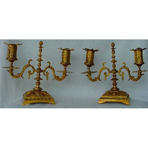 Pair of ornate 19th century gilt bronze ( ormolu ) candelabra - rococco decoration with gargoyles. Measurements: each candelabrum is 8 1/4" high, 8 3/8 from side to side. Delicate scrolling, pierced design. Stands on arched square base with gargoyles / masks on each side. Knops in decreasing size lead to a central pineapple finial. The bobeches are removable - for ease of cleaning Underneath of drip pans have impressed JJ and '257' - probably foundry numbers. In general the candelabra are both in good condition with the exception of a repair between nozzle and drip pan on one stick. (noticeable if you look carefully).