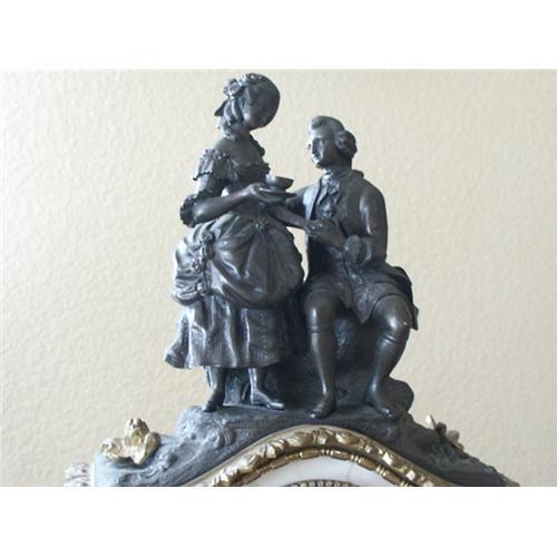 XIX CENTURY ANTIQUE VERY ORNATE MANTLE CLOCK WITH MARBLE BASE, AND WONDERFUL BRONZE FIGURINES . GREAT DETAILS AND QUALITY. DEPICTING BEAUTIFUL YOUNG COUPLE "CUP OF TEA"