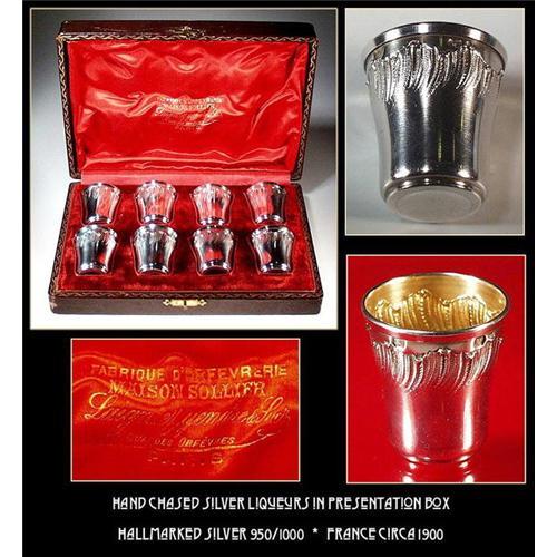 Beautiful antique 8 piece silver liqueur set with original presentation box. Each piece is in excellent condition, 1-5/8" high and 1-1/2" in diameter. Each liqueur is well hallmarked with 2 marks - a Minerva head with #1 and lock of hair, which corresponds to 950/100 silver purity. This is better than Sterling Silver, which is 925/1000. Of other mark (stylized HO) we don't know what this stands for. The inner silk lid is inscribed : Fabrique d'Orfevrerie Maisson Sollier, Laignier Gendre & Suir, 68 Guai Des Orfevres, Paris. Made in France c.1880-1900.