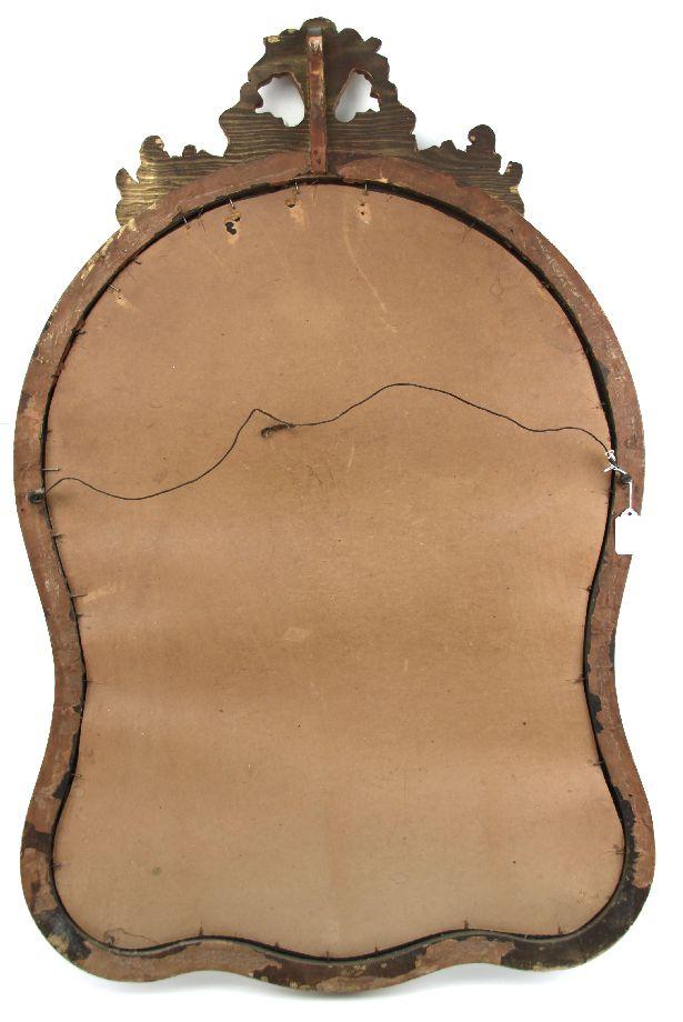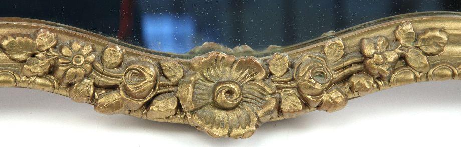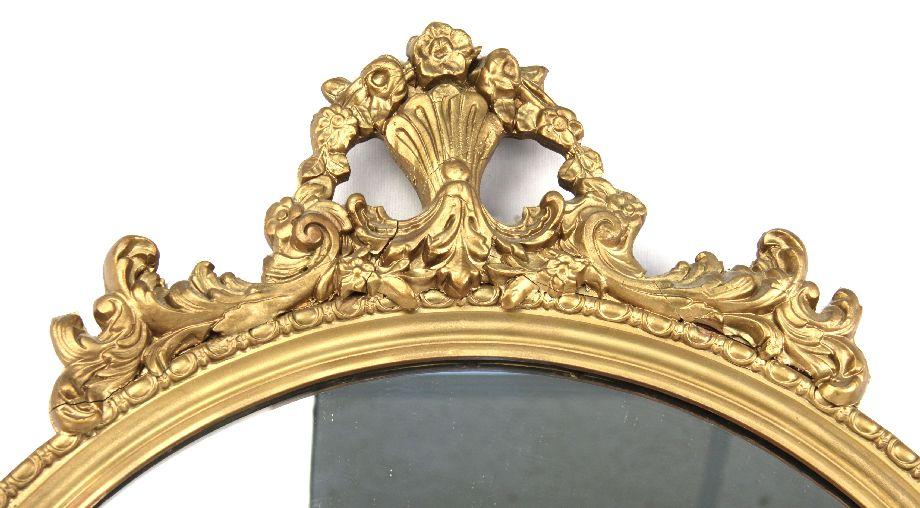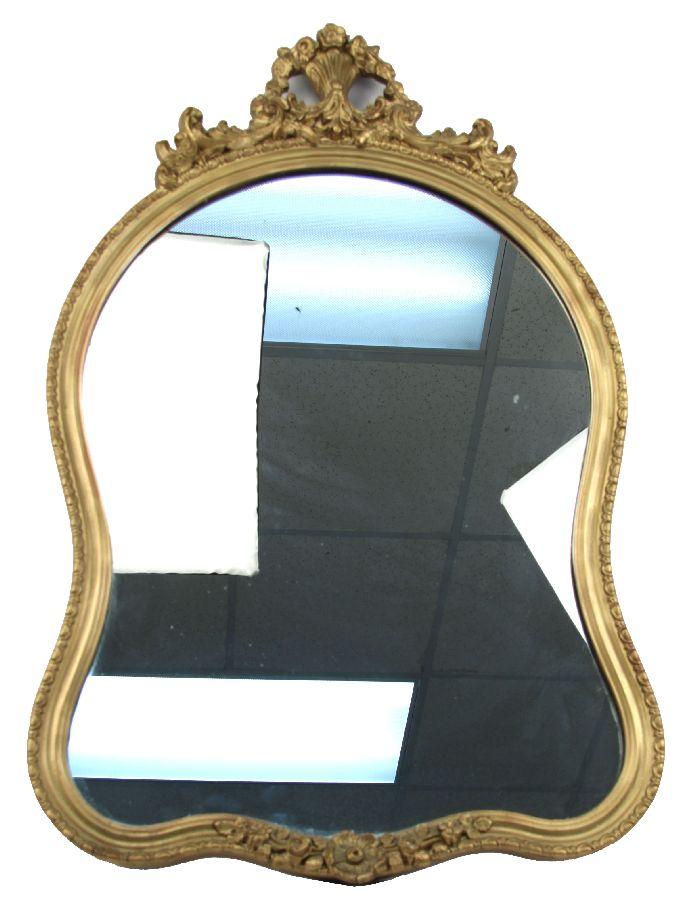 24x38 inches. Antique French style hall mirror with gilt floral moldings. Overall good condition with some cracks to molding.