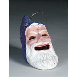 ANTIQUE GERMAN "SANTA" LANTERN.  A fine and highly desirable lantern in near mint condition.  Dark blue color with mica is a slightly harder color to find.  SIZE: from tip of beard to tip of hat 6".  CONDITION:  Near mint, paper for eyes and teeth are missing.  1-4658 (900-1,100)
