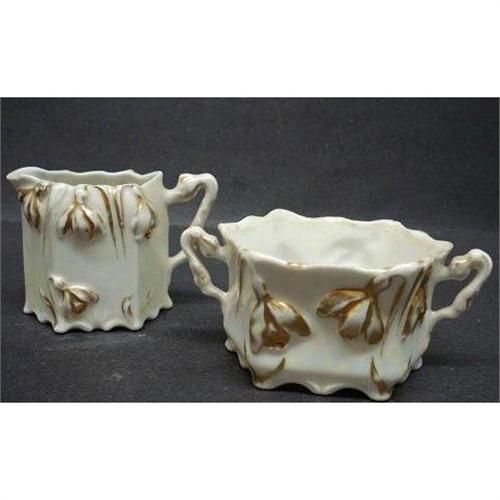 GORGEOUS ANTIQUE SET, CREAM AND SUGAR,IT IS UNMARKED AS THE CASE IS WITH PIECES OF THIS AGE, I THINK IT IS GERMAN MADE, EXCELLENT CONDITION FREE FROM CHIPS OR CRACKS,BUT FOR A GOLD SOME SPOTS ARE GOLD THIN, CREAMER STANDS 3 1/4" HIGH AND SUGAR BOWL 1 3/4" AND 2 1/2" X 3", US Buyer to pay 8.00 for shipping plus insurance.THANKS.