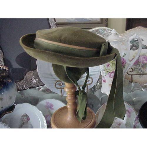 What a sweet antique velvet child's hat! This is a moss green velvet small hat that is similar to the child's riding hat in Gone With The Wind movie. Its in great condition and would be perfect for a large doll or just display it among your antique children's costume collection. A fabulous find!