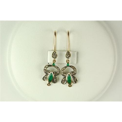 This pair of ANTIQUE Style Earrings are an Accurate and Authentic copy of a pair from the GEORGIAN Period CIRCA 1800 and they are in MINT condition. Dangling from the 14k Gold Earwires are a cluster of ROSE CUT DIAMONDS and a Marquise Cut EMERALD with a smaller EMERALD as accent. The Rose Cut Diamonds and EMERALD are Authentically set in Silver as is typical of Georgian Jewelry. They measure 1 1/2 inches from the top of the 14K Gold Earwire to the bottom of the dangle.