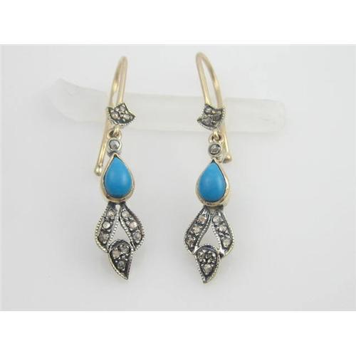 This pair of ANTIQUE Style Earrings are an Accurate and Authentic copy of a pair from the GEORGIAN Period CIRCA 1800 and they are in MINT condition. Dangling from the 14k Gold Earwires are a cluster of ROSE CUT DIAMONDS and a Pearshaped TURQUOISE. The Rose Cut Diamonds and TURQUOISE are Authentically set in Silver as is typical of Georgian Jewelry. They measure 1 1/2 inches from the top of the 14K Gold Earwire to the bottom of the dangle.