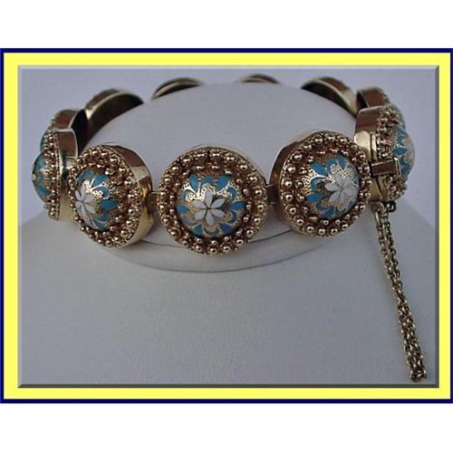 Bracelet consists of 11 sturdy and solid, round links. Each is domed with beautiful blue and white enamelling, in the form of a flower in the center. The