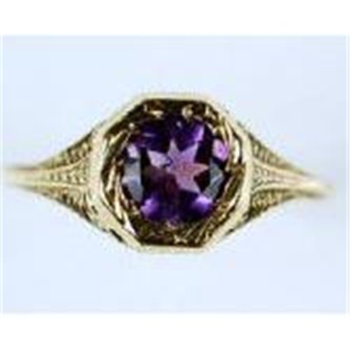 This ANTIQUE Style ring is an AUTHENTIC and ACCURATE copy of a ring from the 1930's but THIS one is in MINT condition. It is 9K GOLD and it features a GENUINE AMETHYST = 3/4 CARAT! There is Stunning FILIGREE work that completely surround the Amethyst. This ring is a Size 7 and it can be resized either larger or smaller.