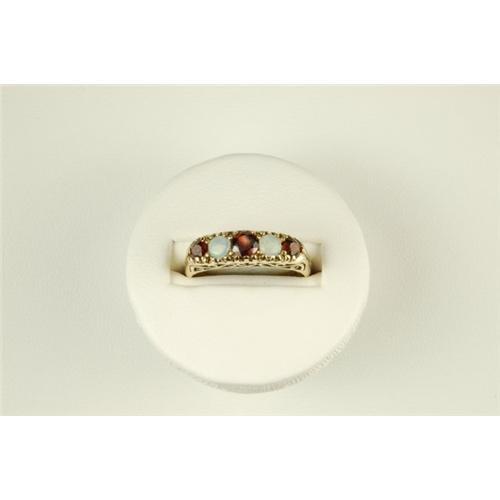 This Antique Style ring is an Authentic and Accurate copy of a ring CIRCA 1900 and THIS one is in MINT condition! It is a 9K Yellow Gold band style ring featuring 2 GENUINE OPALS and 3 GENUINE GARNETS. This ring is a Size 7 and it can be resized either larger or smaller.