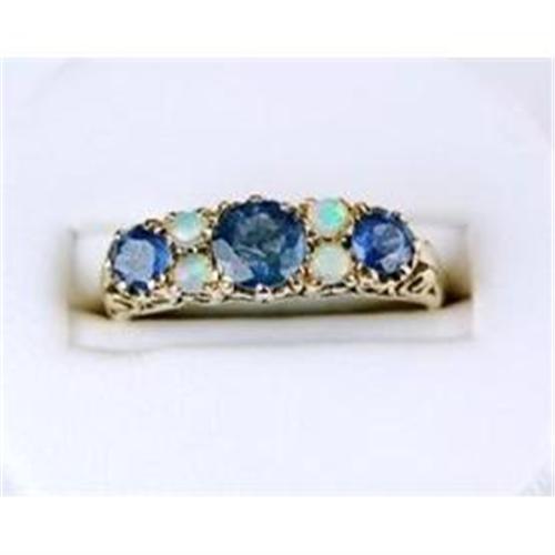 This ANTIQUE Style Ring is an AUTHENTIC and ACCURATE copy of a ring from the VICTORIAN ERA CIRCA 1890 but THIS one is in MINT condition! The Band Style ring is 9K GOLD and it features 3 SAPPHIRES and 4 OPALS set across the top. This ring is a Size 7 and it can be resized.