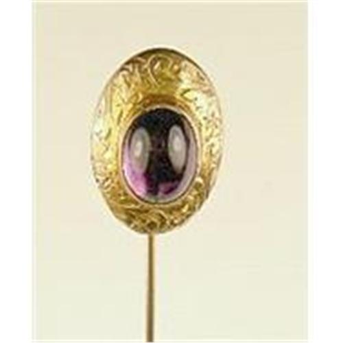 THIS ANTIQUE GOLD VICTORIAN STICKPIN IS CIRCA 1880 AND IT IS IN EXCELLENT CONDITION! It is a 10K Yellow Gold Stickpin with a highly engraved Gold frame surrounding an Oval AMETHYST. There is a MAKERS MARK indicating that the pin might be Georgian.