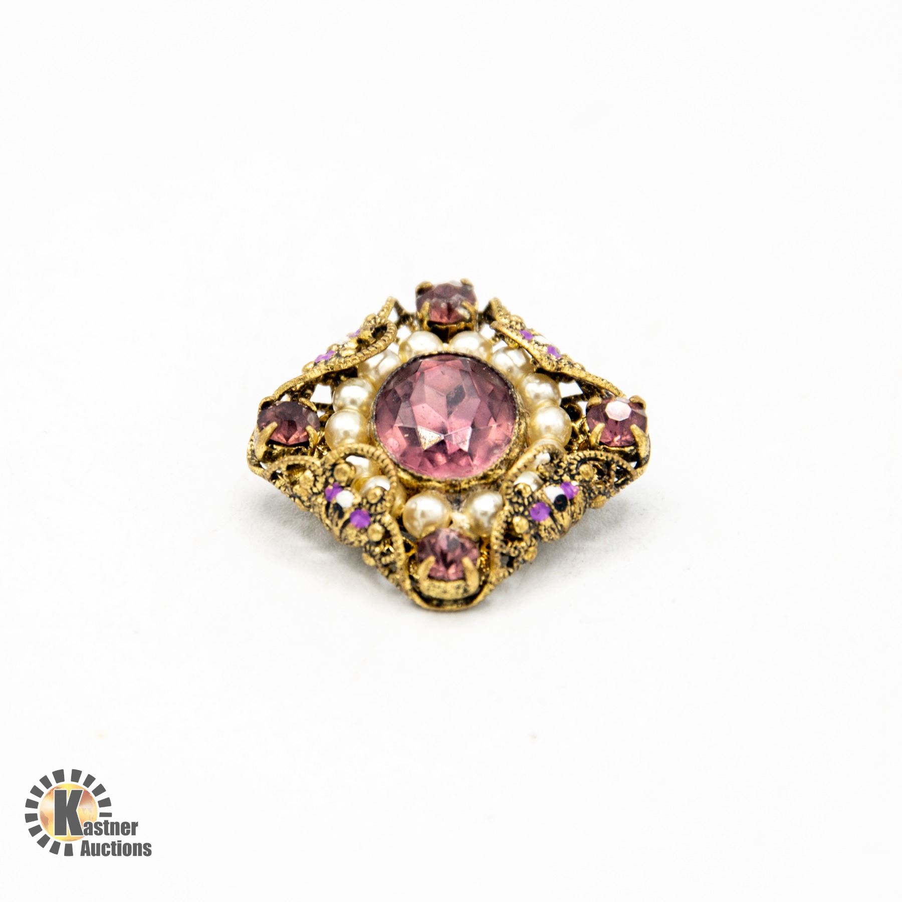 ANTIQUE GOLD TONE FILIGREE BROOCH WITH STONES
