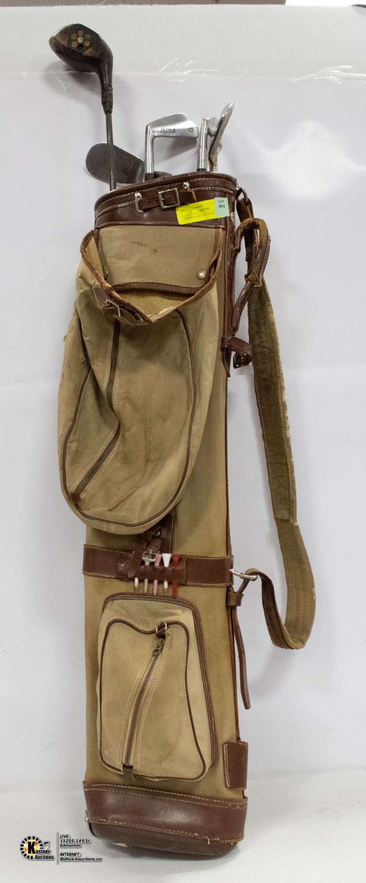 ONE ANTIQUE GOLF BAG - ONE DRIVER, FOUR IRONS (2,3,5,8), ONE PUTTER, ONE HICKORY PUTTER