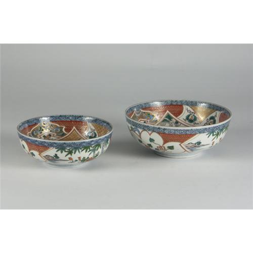 PORCELAIN: Two coordinated Japanese Imari bowls depicting golden crane in asymmetrical cartouche, blue underglaze decoration; signature at underside. Early 20th c. 7.25''-8.25'' D