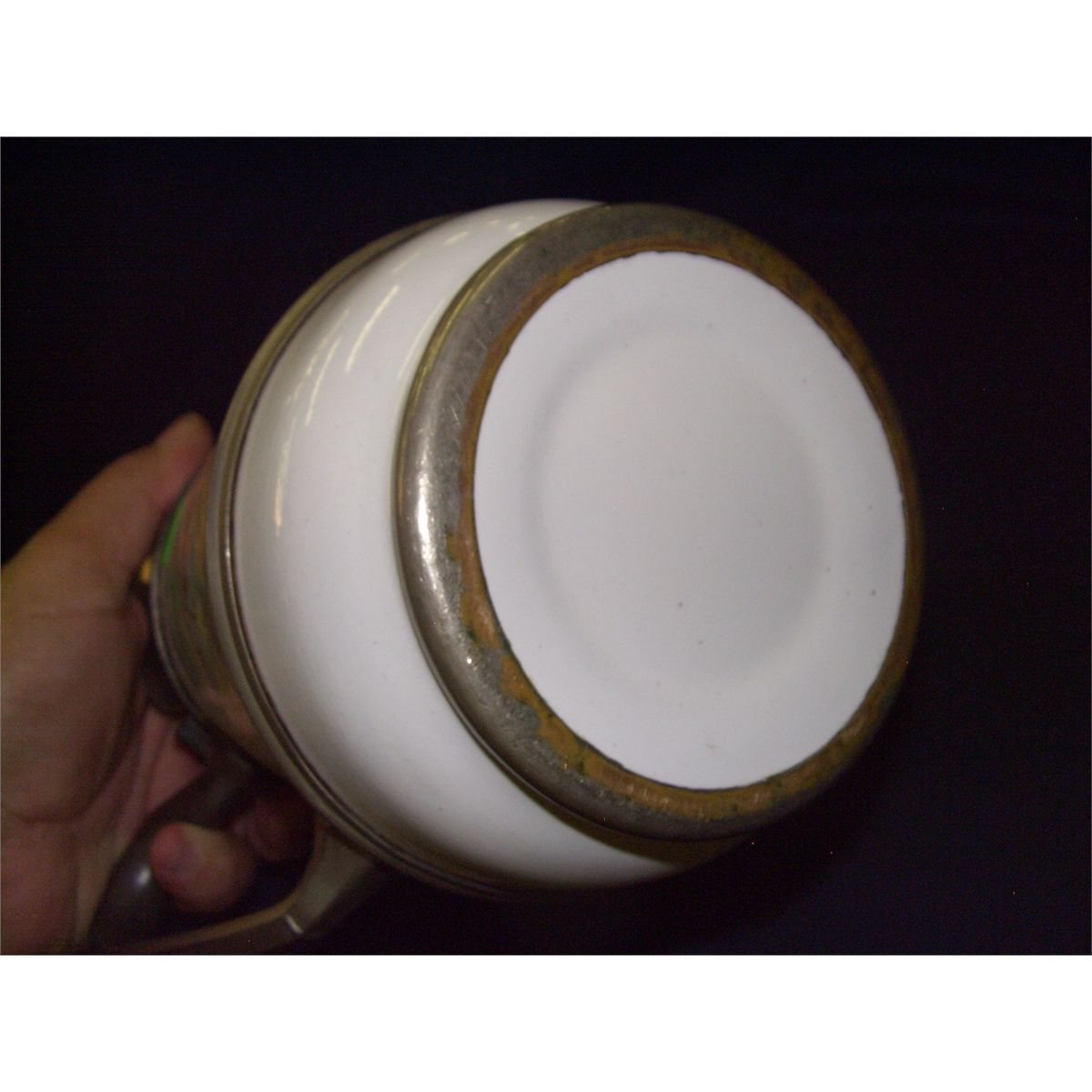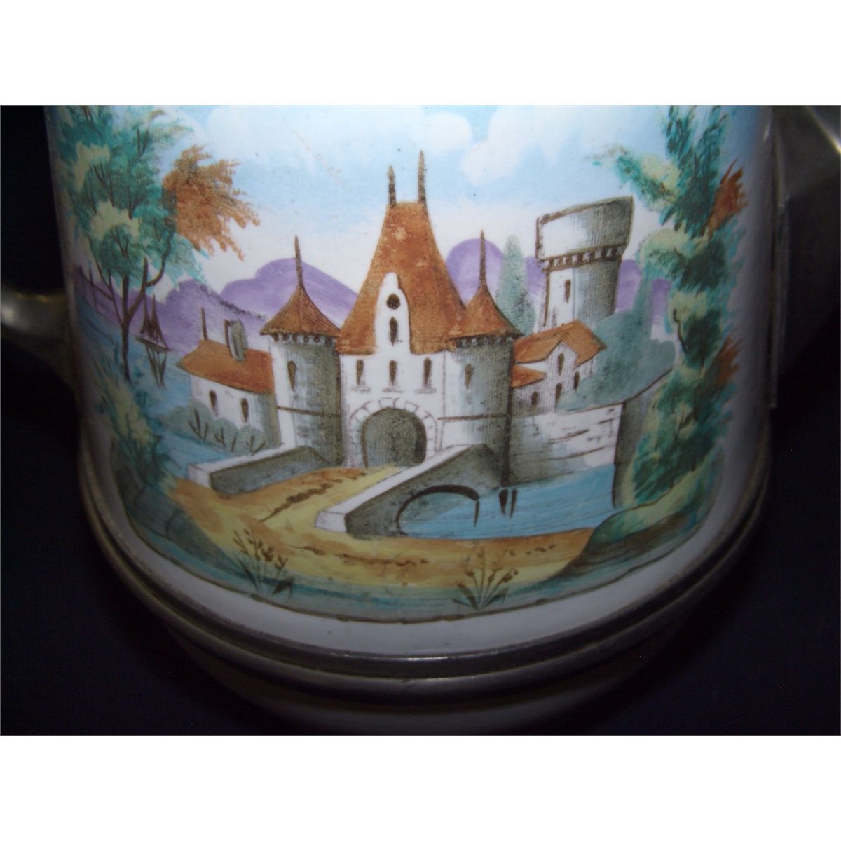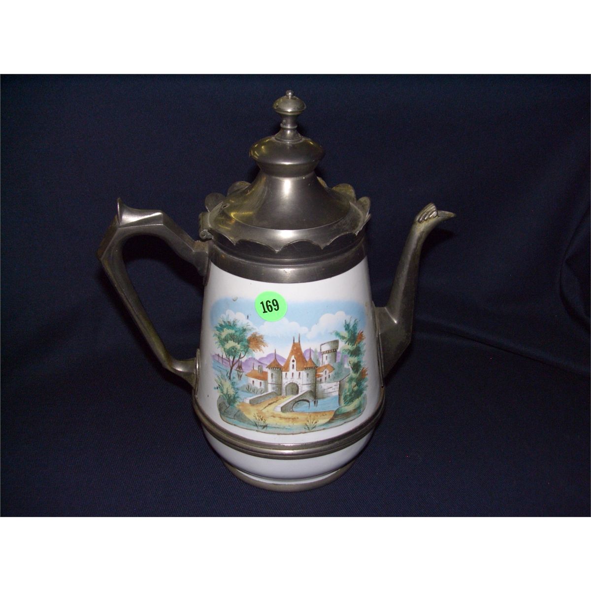 ANTIQUE GRAY GRANITEWARE ENAMELWARE & PEWTER COFFEE POT WITH CASTLE DESIGN 10 1/4