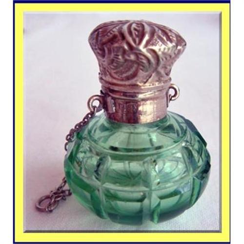 Antique green cut glass and sterling silver chatelaine perfume / scent bottle. Made in Birmingham England, 1900-1901. <P><P>