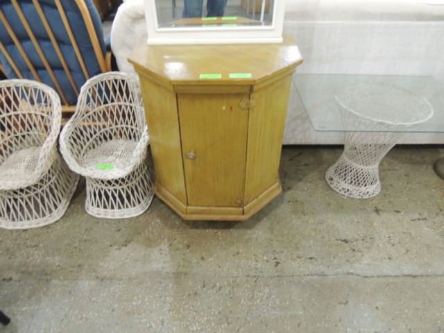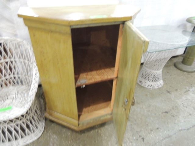 NICE ANTIQUE GREEN FINISHED END TABLE FOYER TABLE OR CABINET IN OCTAGON SHAPE WITH DOORS. AS SHOWN. 28" ACROSS AND 29" TALL.