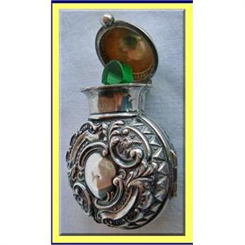 Victorian antiqiue green glass perfume bottle in it's original fitted sterling silver case. Made Birmingham, England, 1900 - 1901. <P><P>