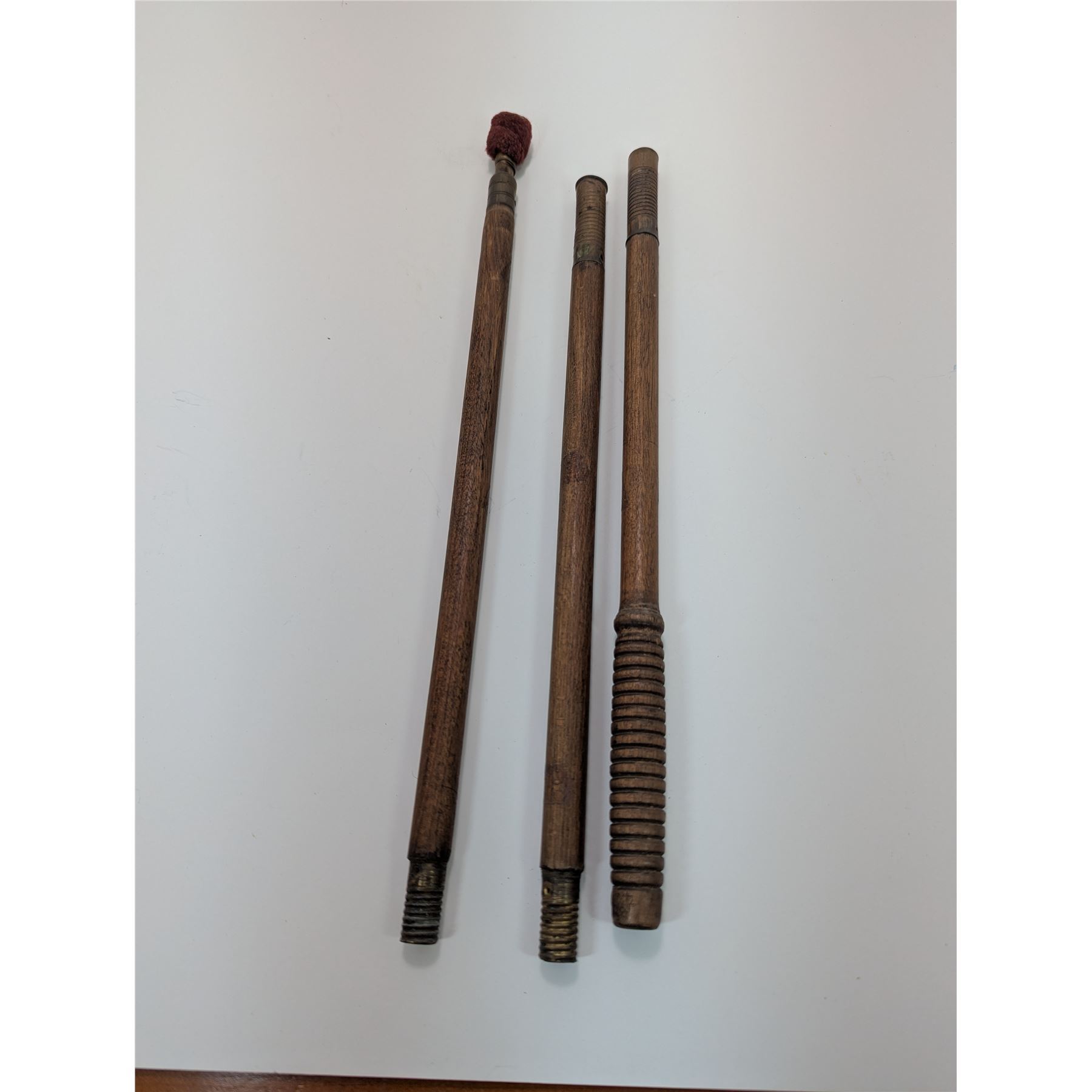 ANTIQUE GUN CLEANING STICK breaks down into three pieces, with threaded brass fittings and red felt fob for barrel polishing. This oak stick is from the end of the 1800's.