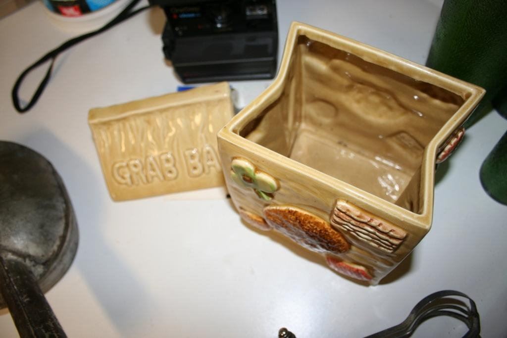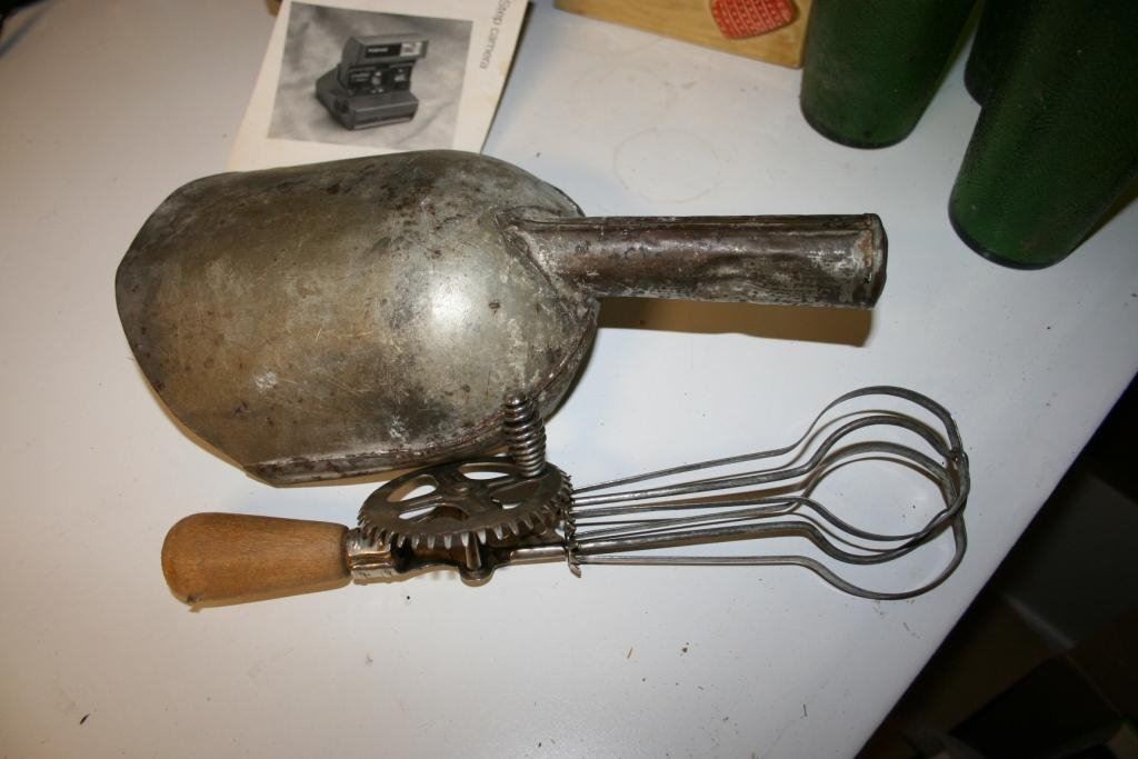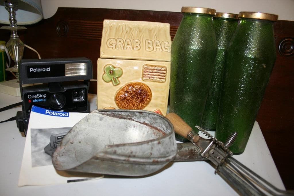 ANTIQUE HAND BLENDER, FLOUR SCOOP, COLLECTOR COOKIE JAR, THREE ANTIQUE JUICE BOTTLES AND POLAROID CA