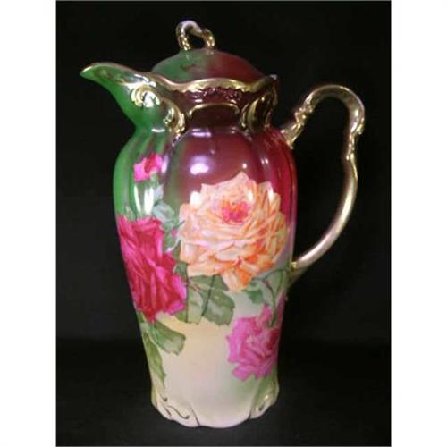 Beautiful antique handpainted Chocolate Pot with lush rich ROSES! The pot is gorgeous with lavish use of gold trim. It measures 9" high by 7" wide. There is slight loss of gilt on rim and handle. No chips, cracks or crazing, just lovely! Perfect for the Shabby Chic, Romantic Cottage or Victorian Decor!