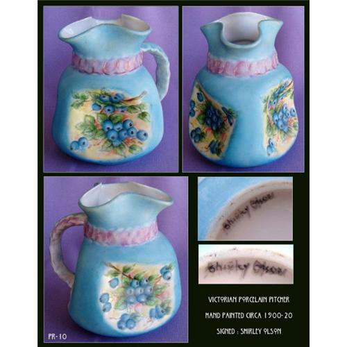 Beautiful Victorian hand painted pitcher with Blueberries. It is most likely French or German porcelain "blank" decorated in the U.S.A, which was very fashionable during Victorian era. Artist signed : Shirley Olson on the base, circa 1900-20. Very good condition, no chips, cracks or repairs. Dimension : 6-1/4" high and approx 6" wide over the handle. in diameter. Germany or France circa 1900-20's.
