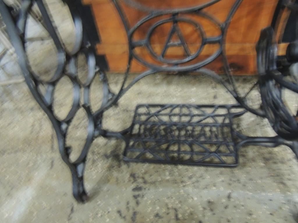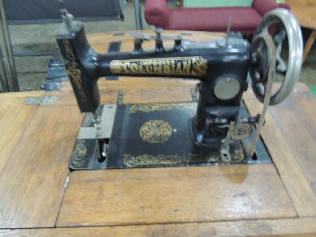 IMPROVED COLUMBIAN ANTIQUE SEWING MACHINE, HARTMAN, TABLE FOLDING TABLE, AS SHOWN SEE PHOTO FOR MORE DETAILS.