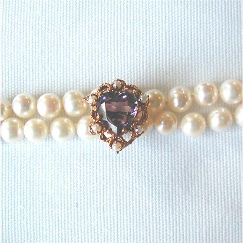 ANTIQUE FACETED GEM-AMETHYST HEART-SHAPE CLASP SET IN 14K YELLOW GOLD WITH SEED PEARLS ... PLEASE NOTE: This clasp is shown with pearls to give an idea of how it would work with different pearls. We are selling the clasp ONLY. This clasp has rings for 2 strands of pearls or 4 to 6 strands of small pearls. STAMPED: 14K ... This clasp can also be worn on the side depending on your pearls. It is very difficult today to find beautiful vintage pearl clasps. This is a gem. BURTON BROOK FARM ANTIQUES for the unique & rare.