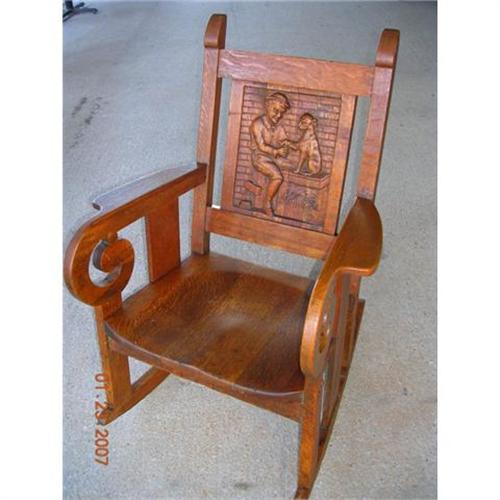 VERY OLD HAND CARVED OAK ROCKER WITH OUTSTANDING HEAVILY CARVED BACK. WE BELIEVE THE EXQUISITE CARVED BACK PORTRAYS A GERMAN PEASANT TENDING TO HIS DOG'S INJURED PAW. POSSIBLE EARLY 1800'S.