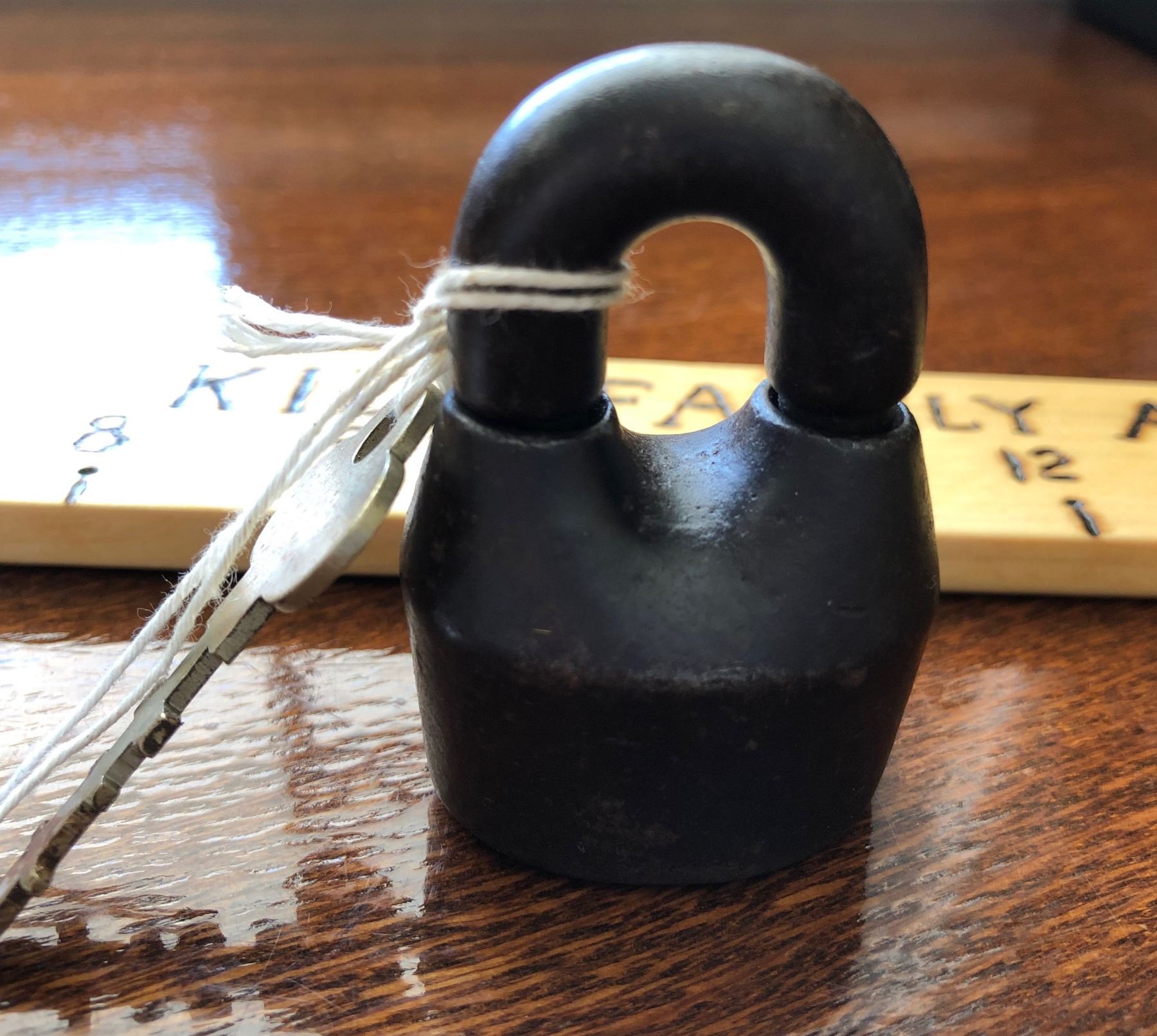 ANTIQUE HEAVY CAST IRON JAIL CELL PADLOCK WITH REMOVABLE SHACKLE & KEY