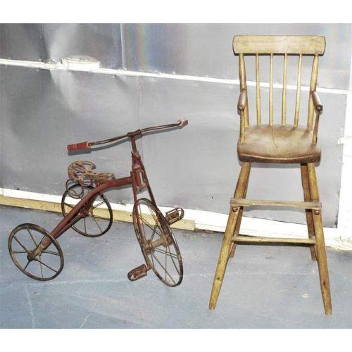 ANTIQUE HIGHCHAIR together with an old TRICYCLE